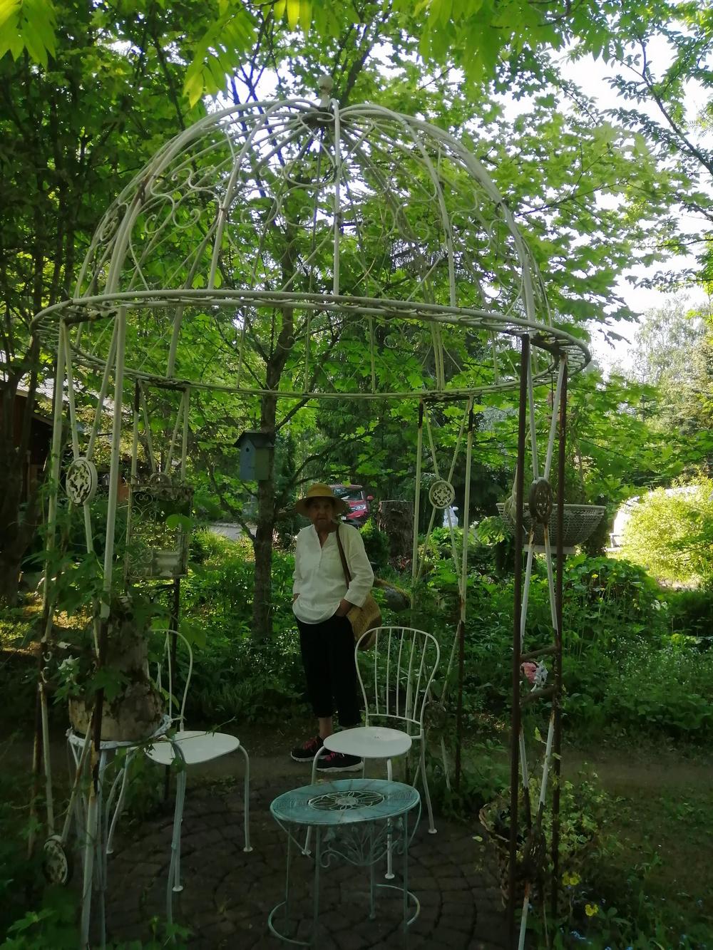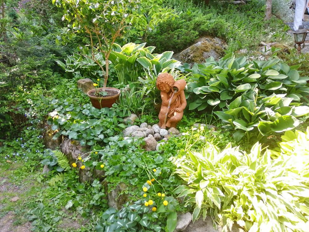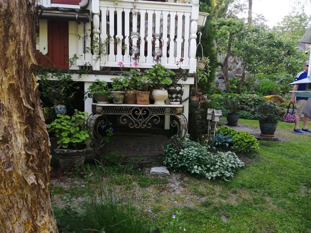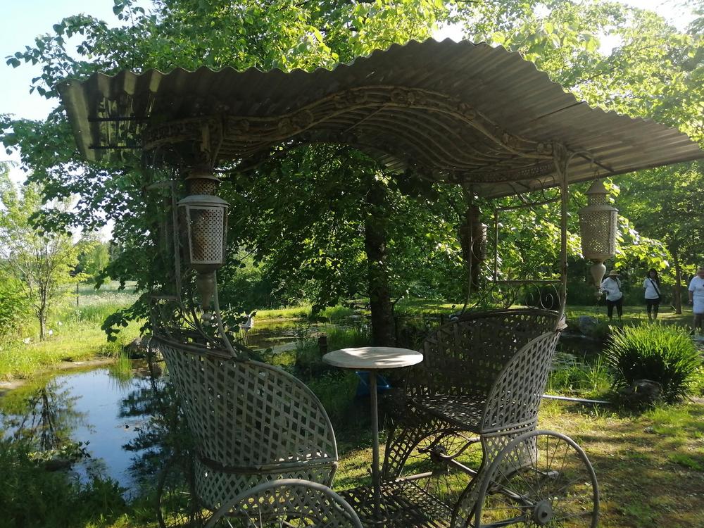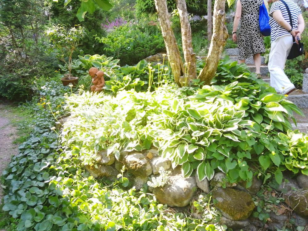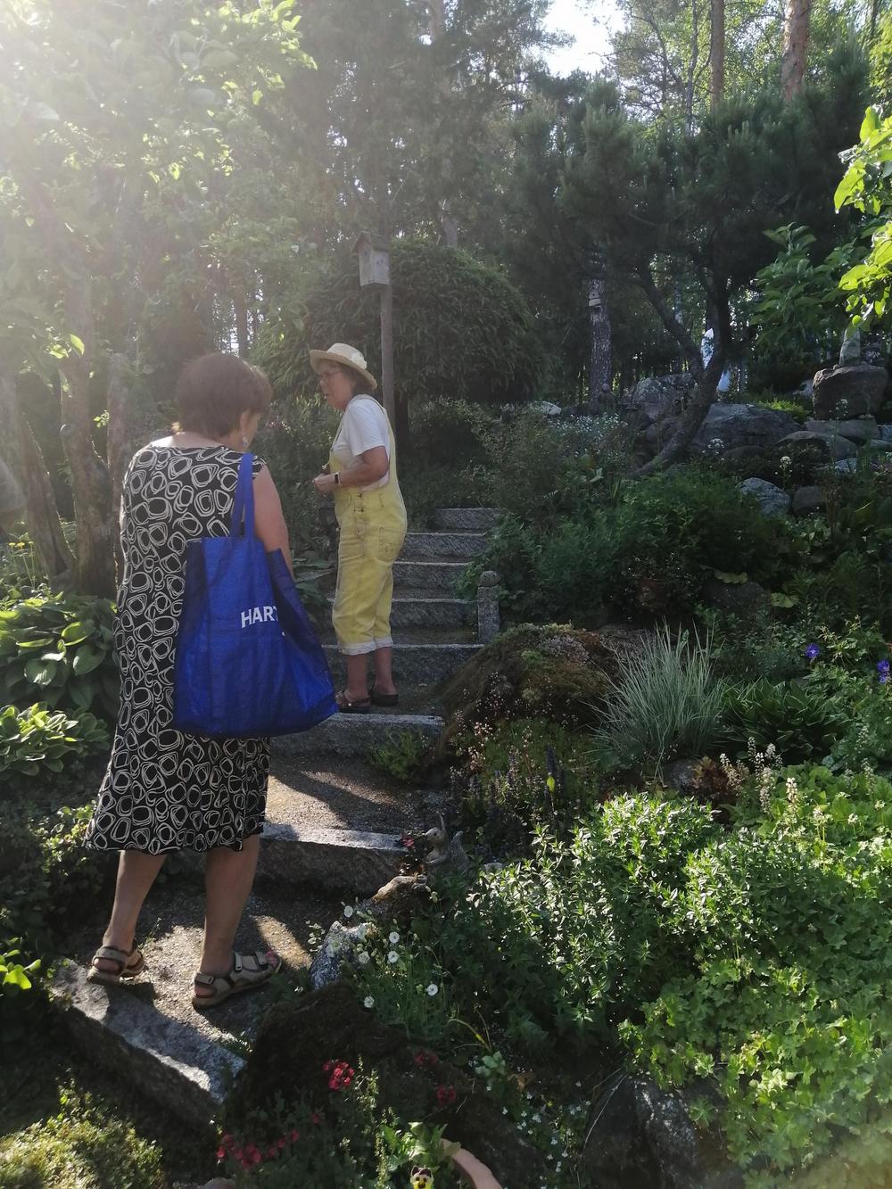 Meitä marttoja (ja muutama avec) oli paikalla parikymmentä toteamassa, että puutarha on mykistävä. Paitsi lukuisia perennoja, rodoja, atsaleapensaita, kukkivia pensaita ja lukematonta määrää erilaisia puita, saimme ihastella puutarhan rakenteita ja koristeita. Polkuja, siltoja, istumaryhmiä, lampia, puro, keramiikkaa, kivilintuja ja -olentoja, veistoksia. Mikkolan pariskunnan puutarha on satumaisen kaunis!