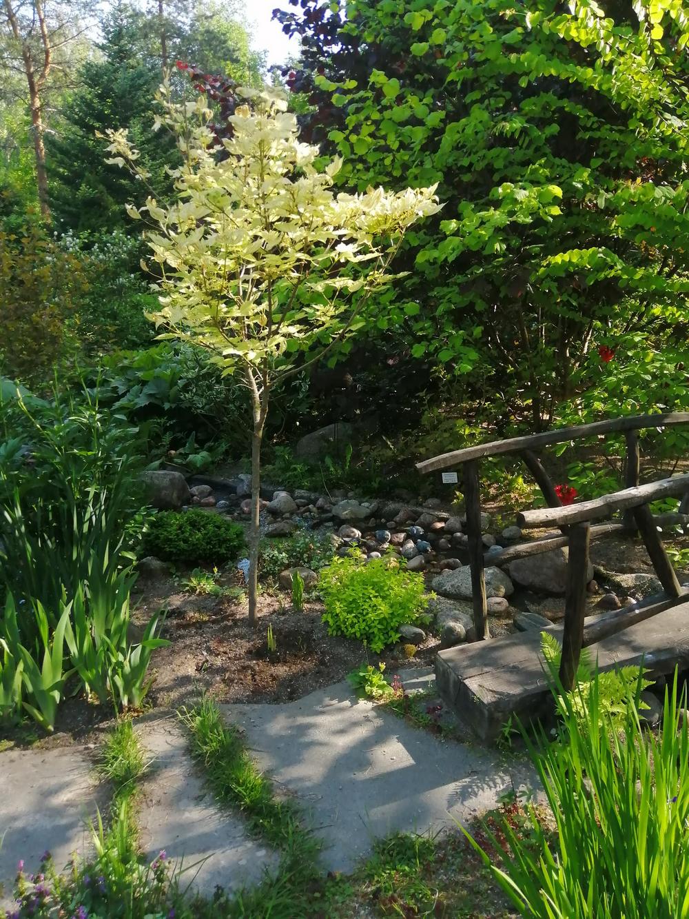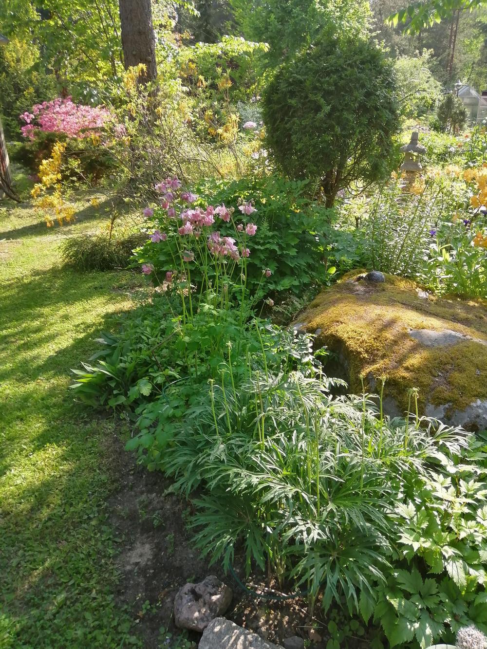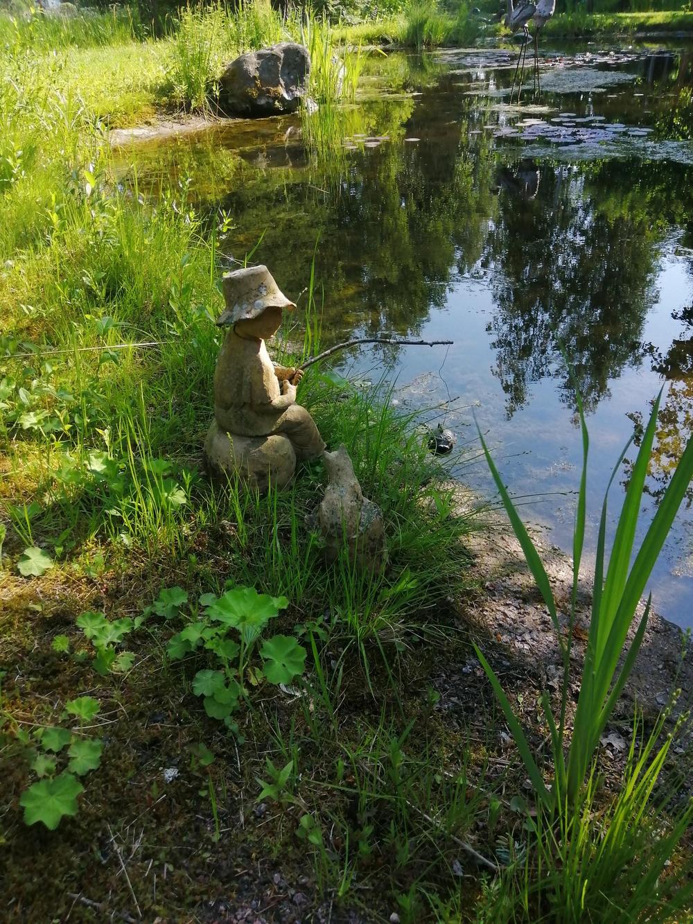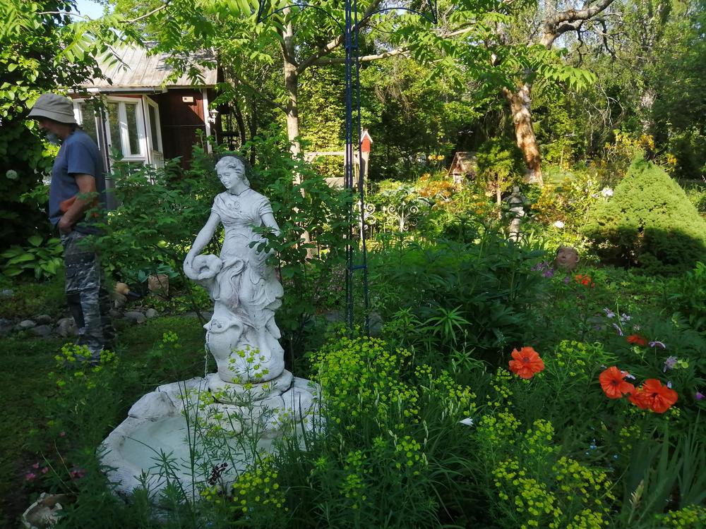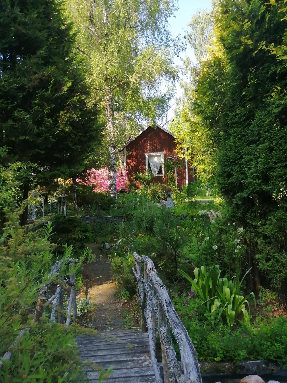 Meitä marttoja (ja muutama avec) oli paikalla parikymmentä toteamassa, että puutarha on mykistävä. Paitsi lukuisia perennoja, rodoja, atsaleapensaita, kukkivia pensaita ja lukematonta määrää erilaisia puita, saimme ihastella puutarhan rakenteita ja koristeita. Polkuja, siltoja, istumaryhmiä, lampia, puro, keramiikkaa, kivilintuja ja -olentoja, veistoksia. Mikkolan pariskunnan puutarha on satumaisen kaunis!