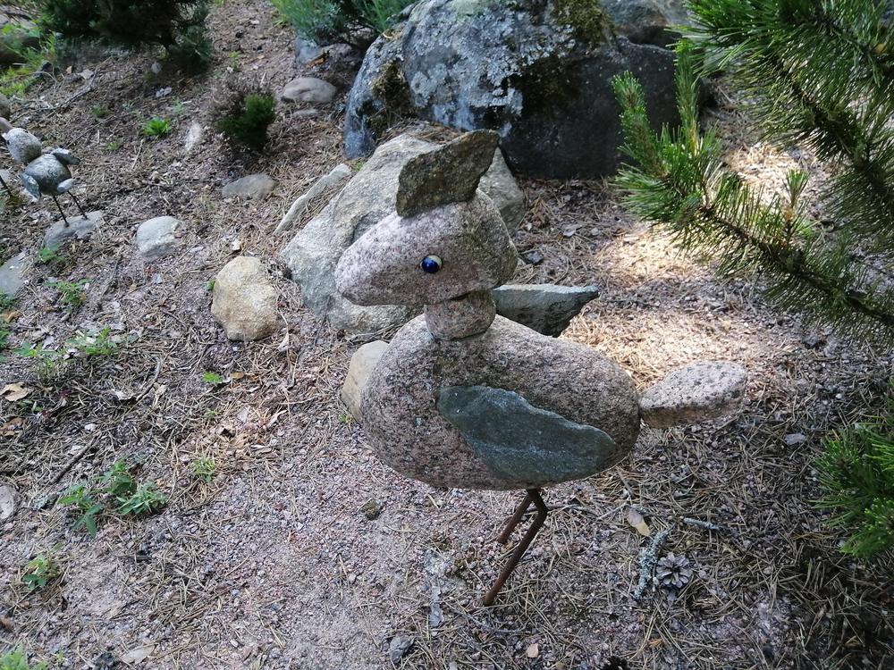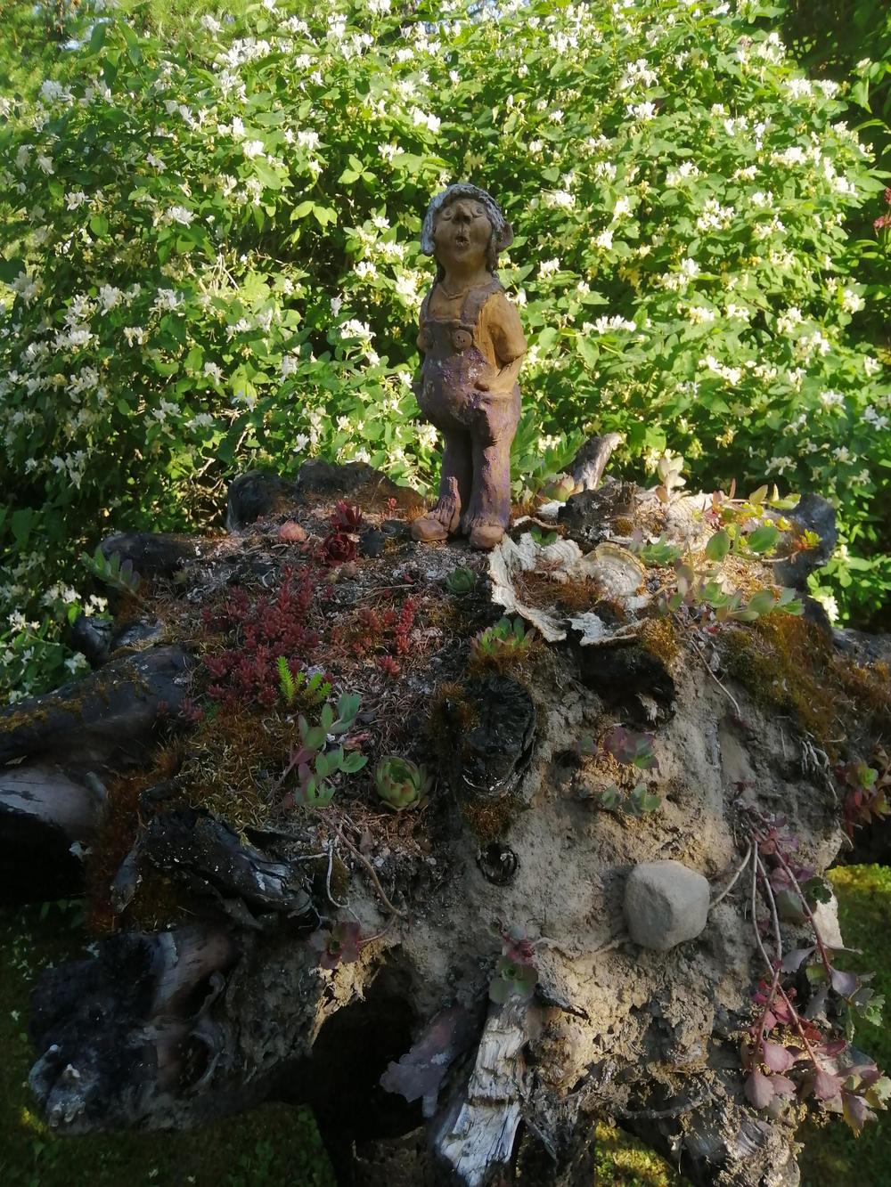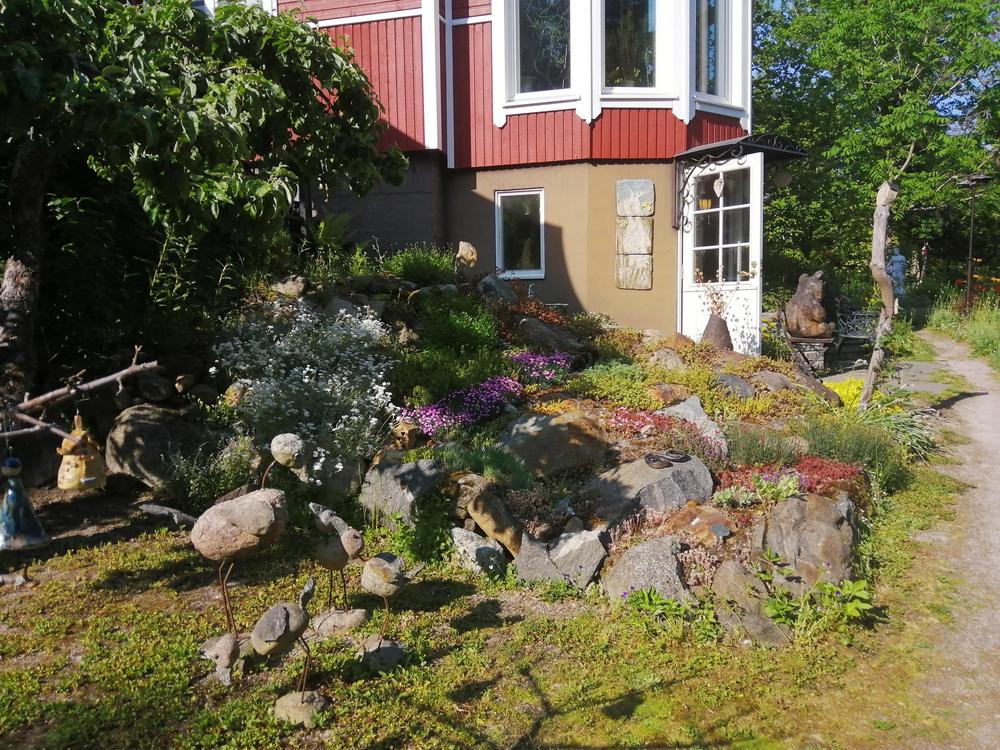 Omistajapariskunta Sirpa ja Juhani ovat sovittaneet puutarhaansa Sirpan tekemiä hienoja keramiikkatöitä, Juhani on erikoistunut puu- ja kiviteoksiin.
