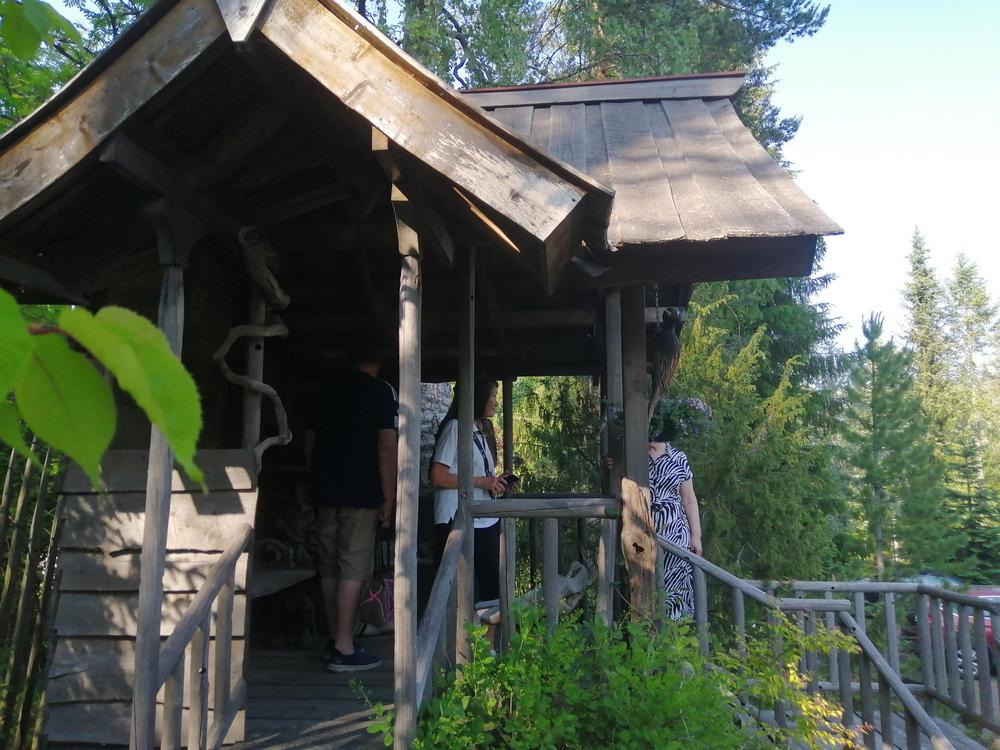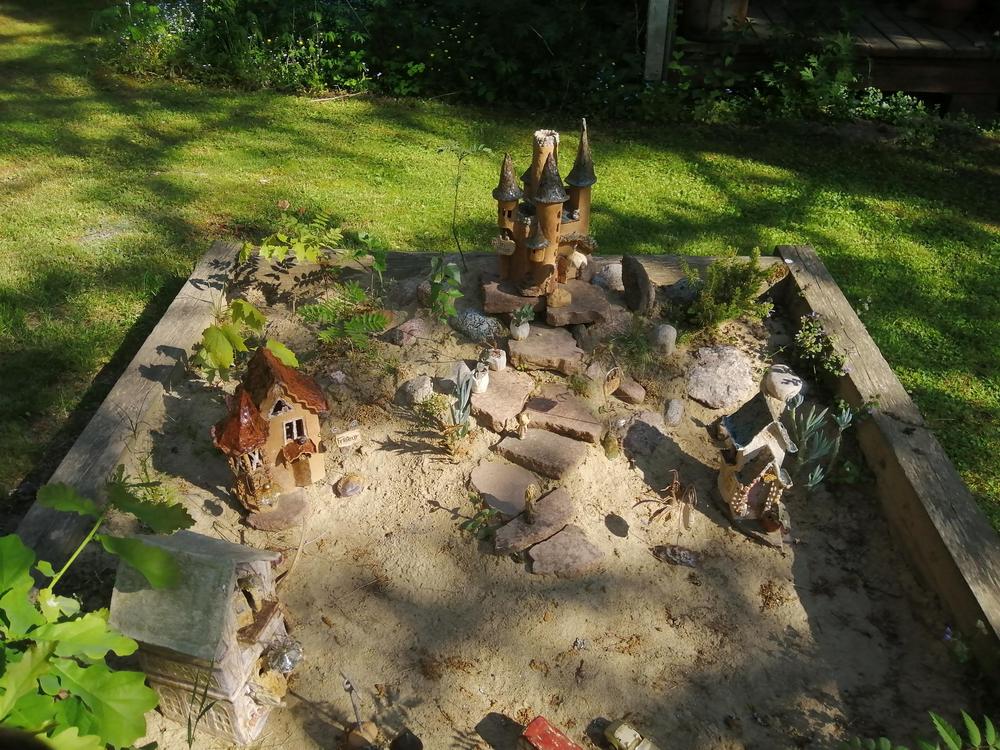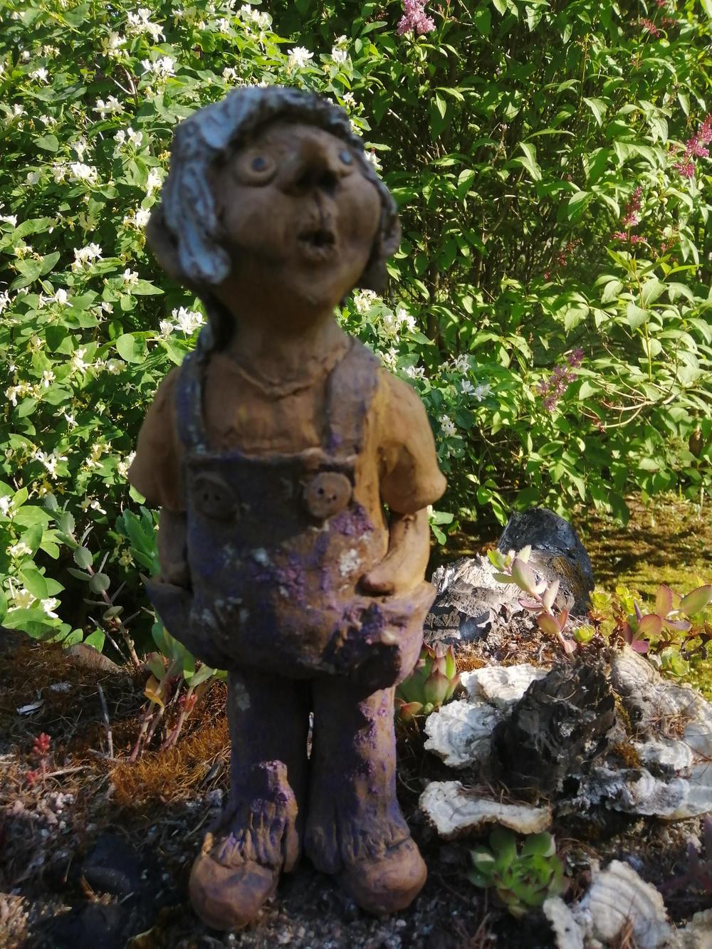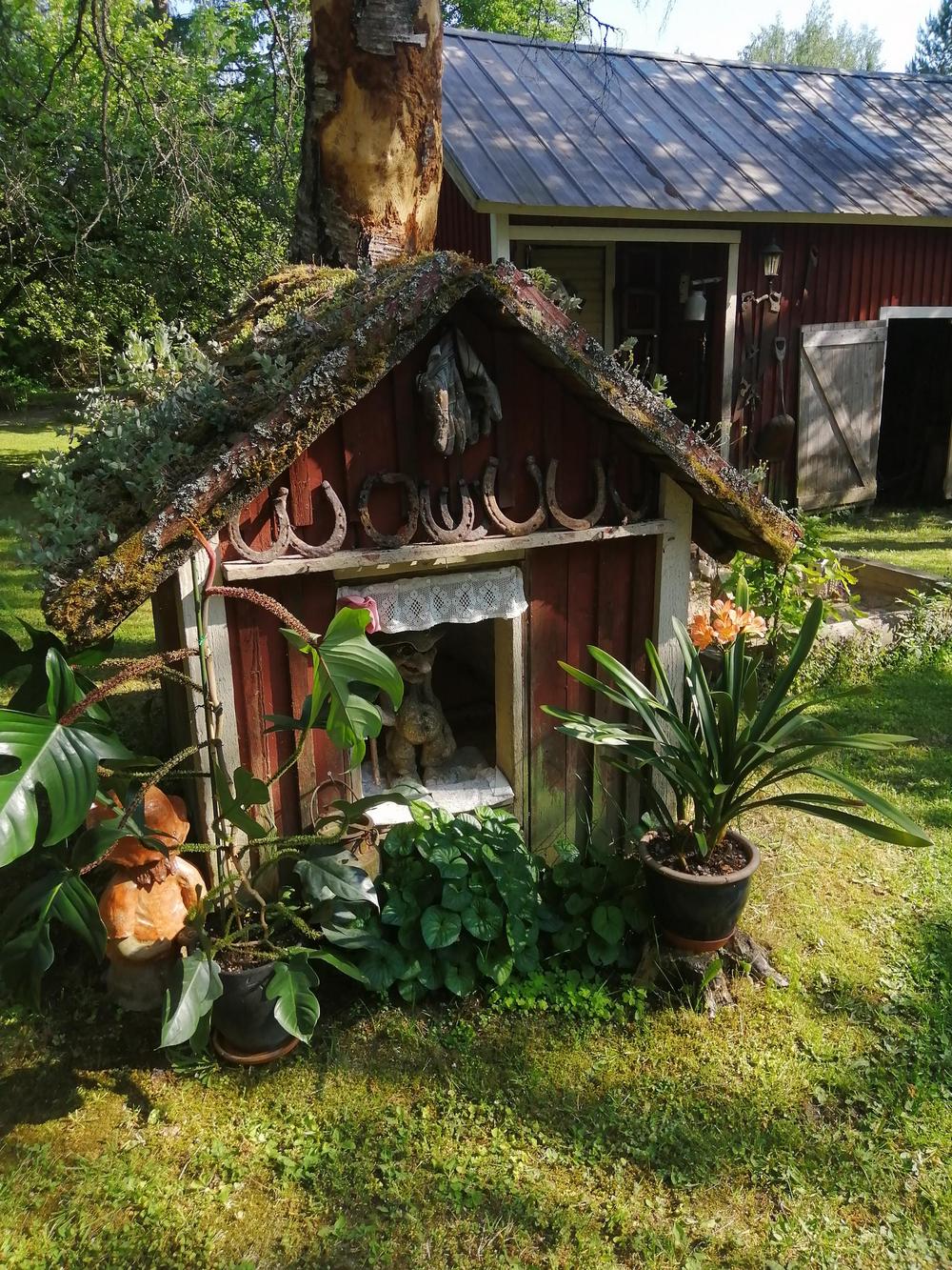 Omistajapariskunta Sirpa ja Juhani ovat sovittaneet puutarhaansa Sirpan tekemiä hienoja keramiikkatöitä, Juhani on erikoistunut puu- ja kiviteoksiin.