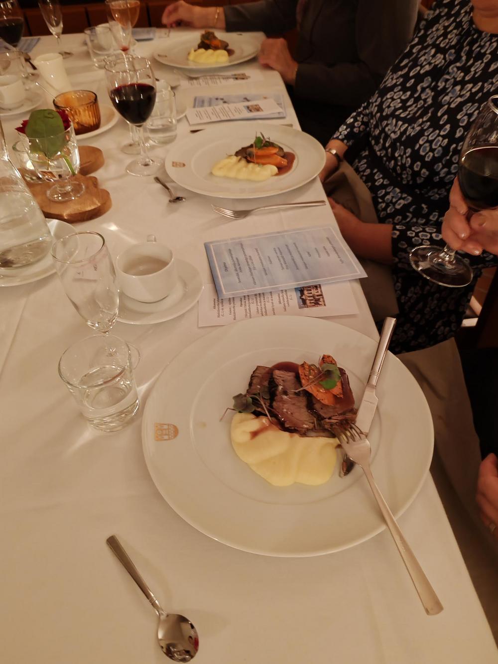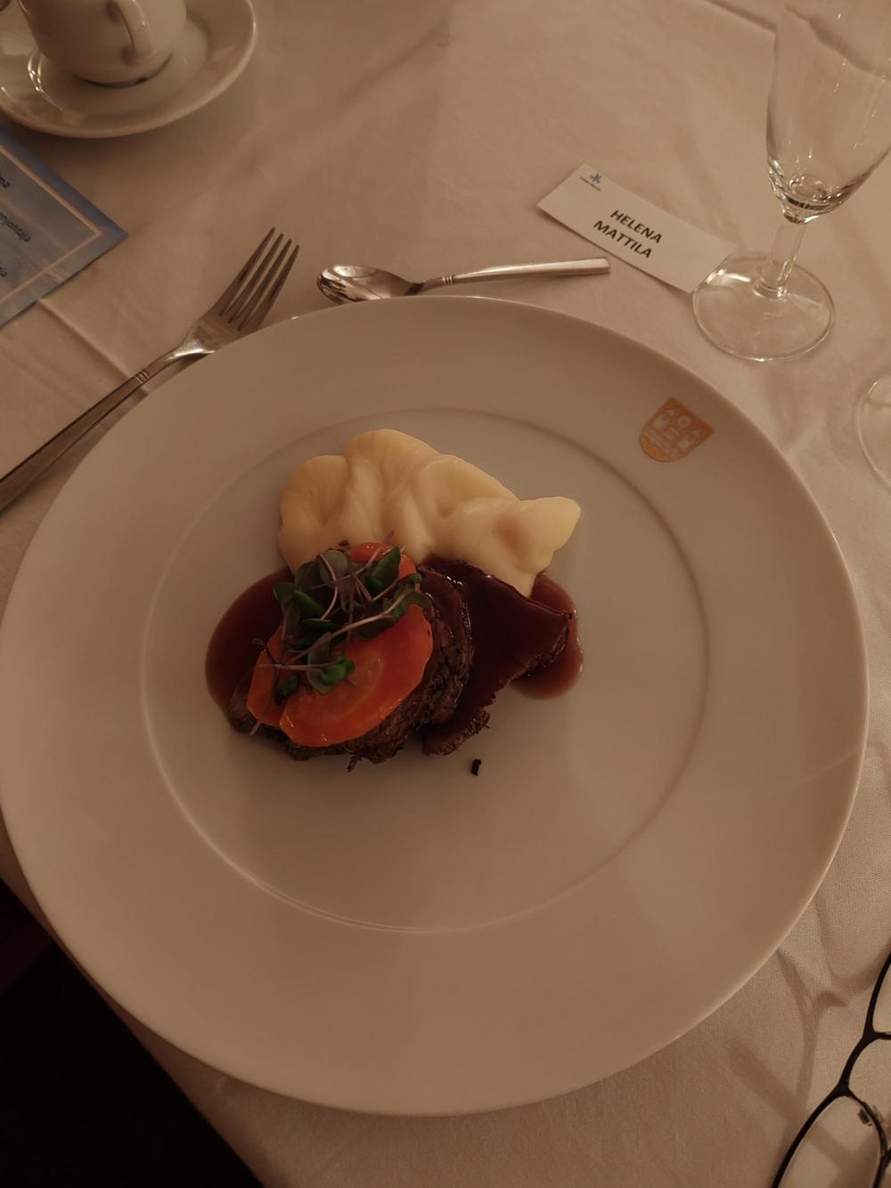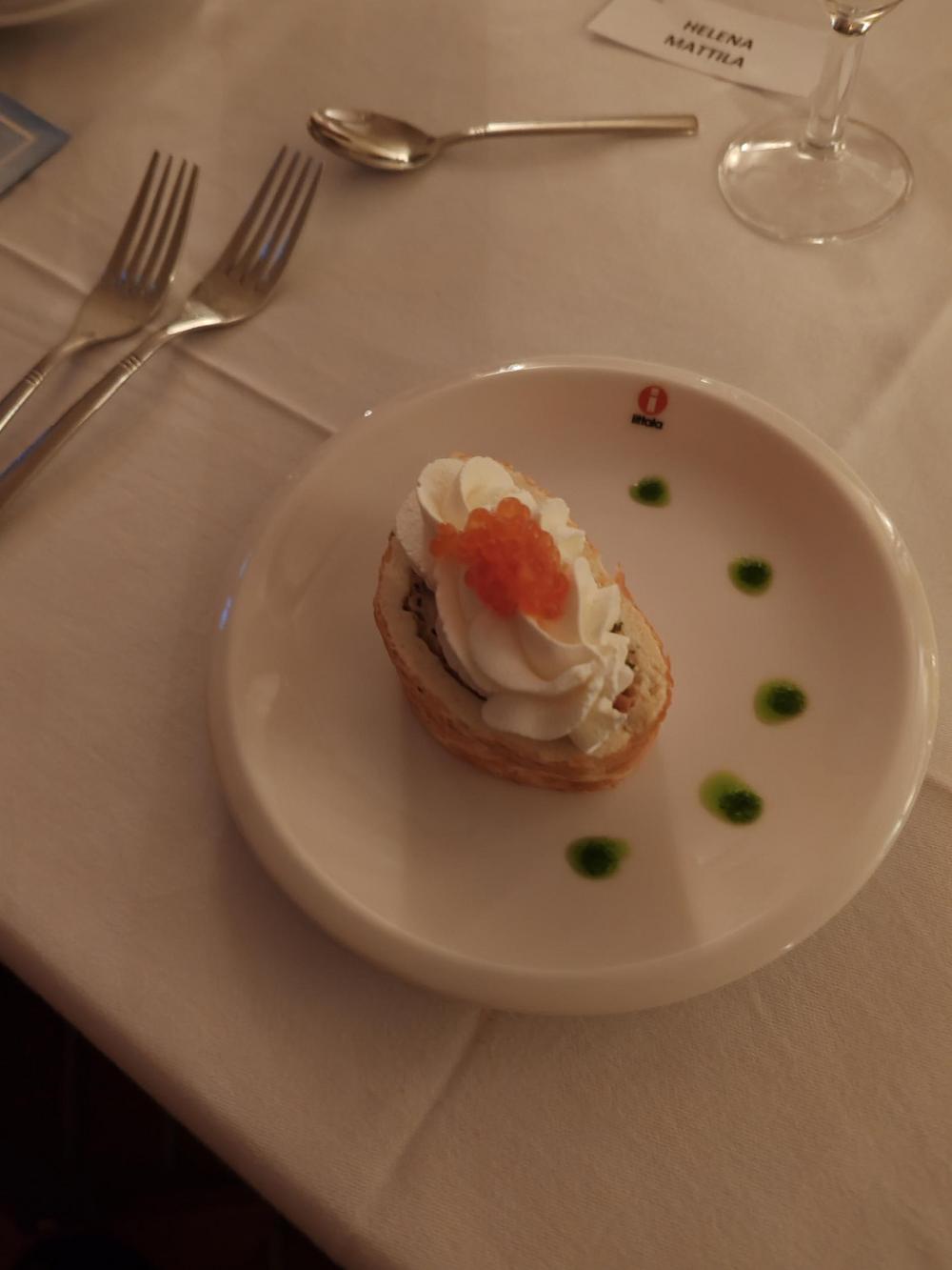 Raatikellari oli valmistanut maistuvan ja kauniin kolmen ruokalajin menun, joka tarjoiltiin pöytiin.