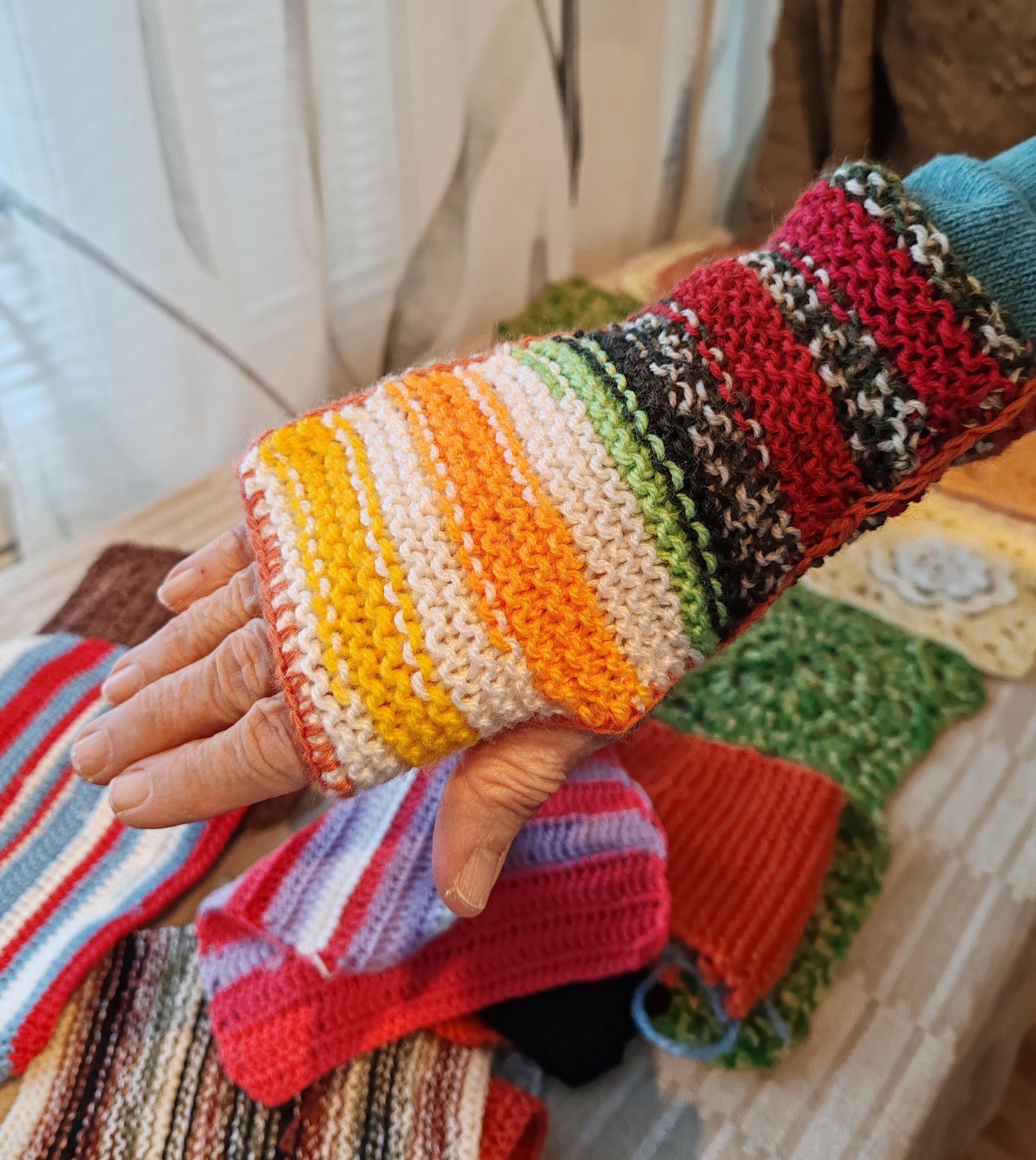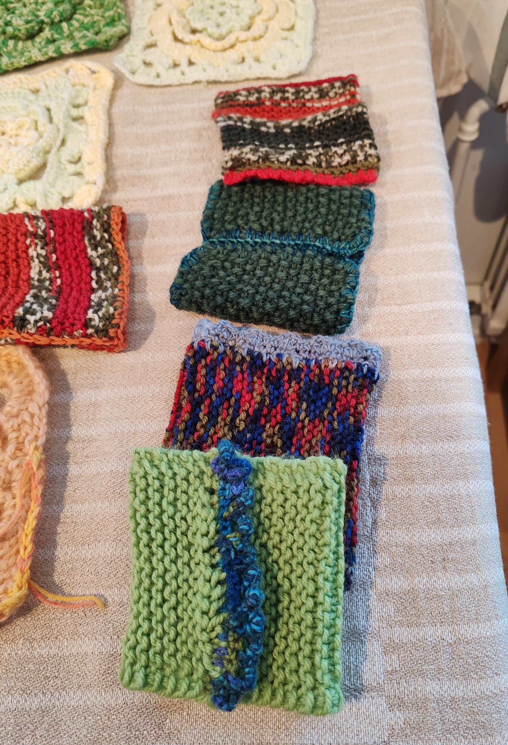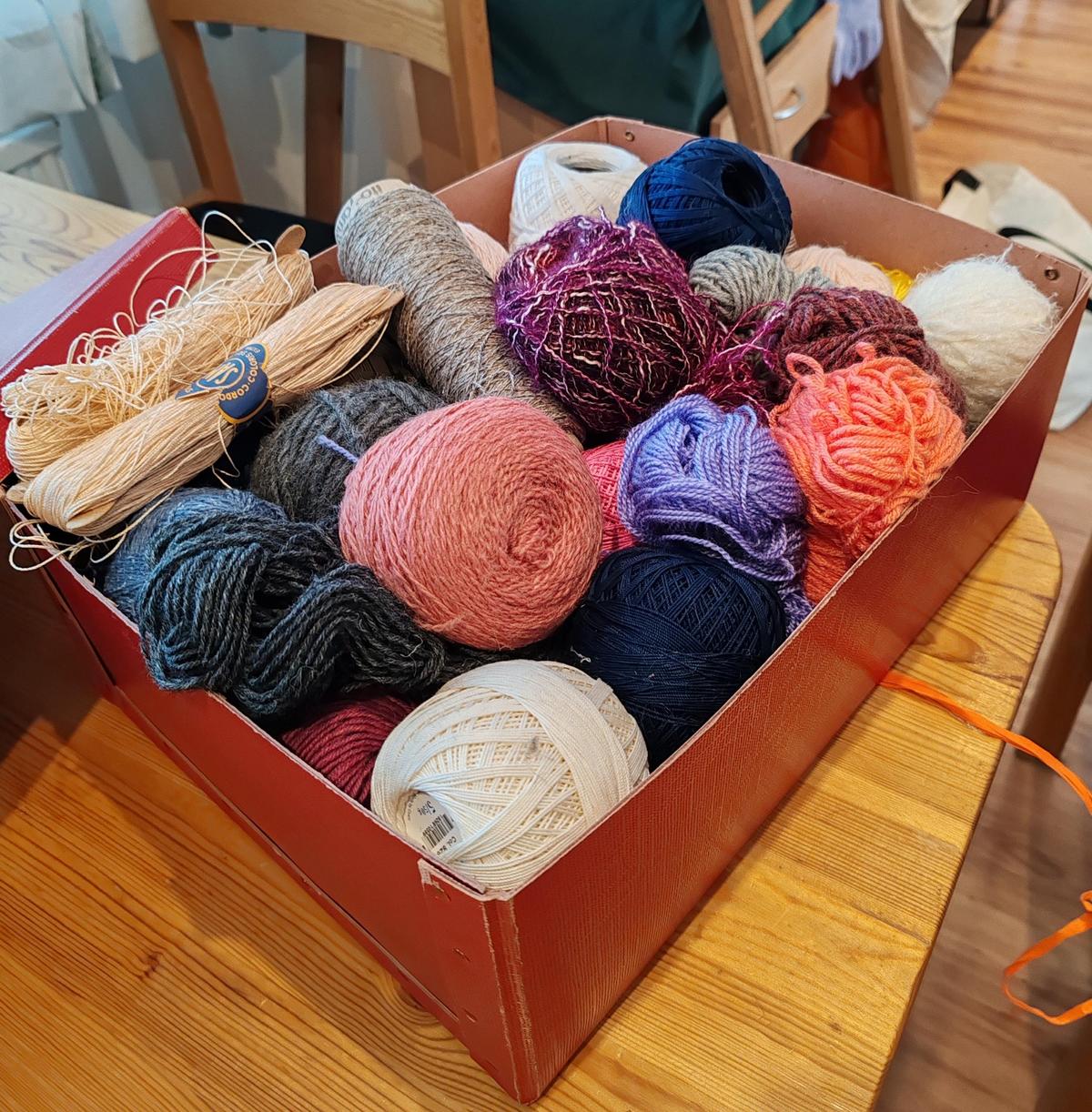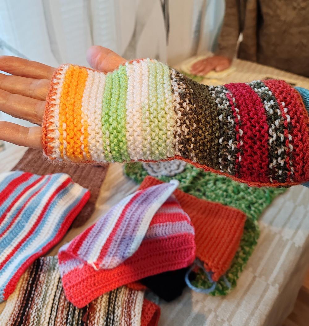 Meillä on tarjolla myös laatikollinen lankoja. Sen lisäksi olemme saaneet Aimokoulun varastoista valmiiksi neulottuja ja virkattuja lappusia, joista voisi tehdä ranteenlämmittimiä, kämmekkäitä tai pieniä huiveja lappuja yhdistämällä. Niistä saa värikkäitä tuotteita ompelemalla muutaman sauman.