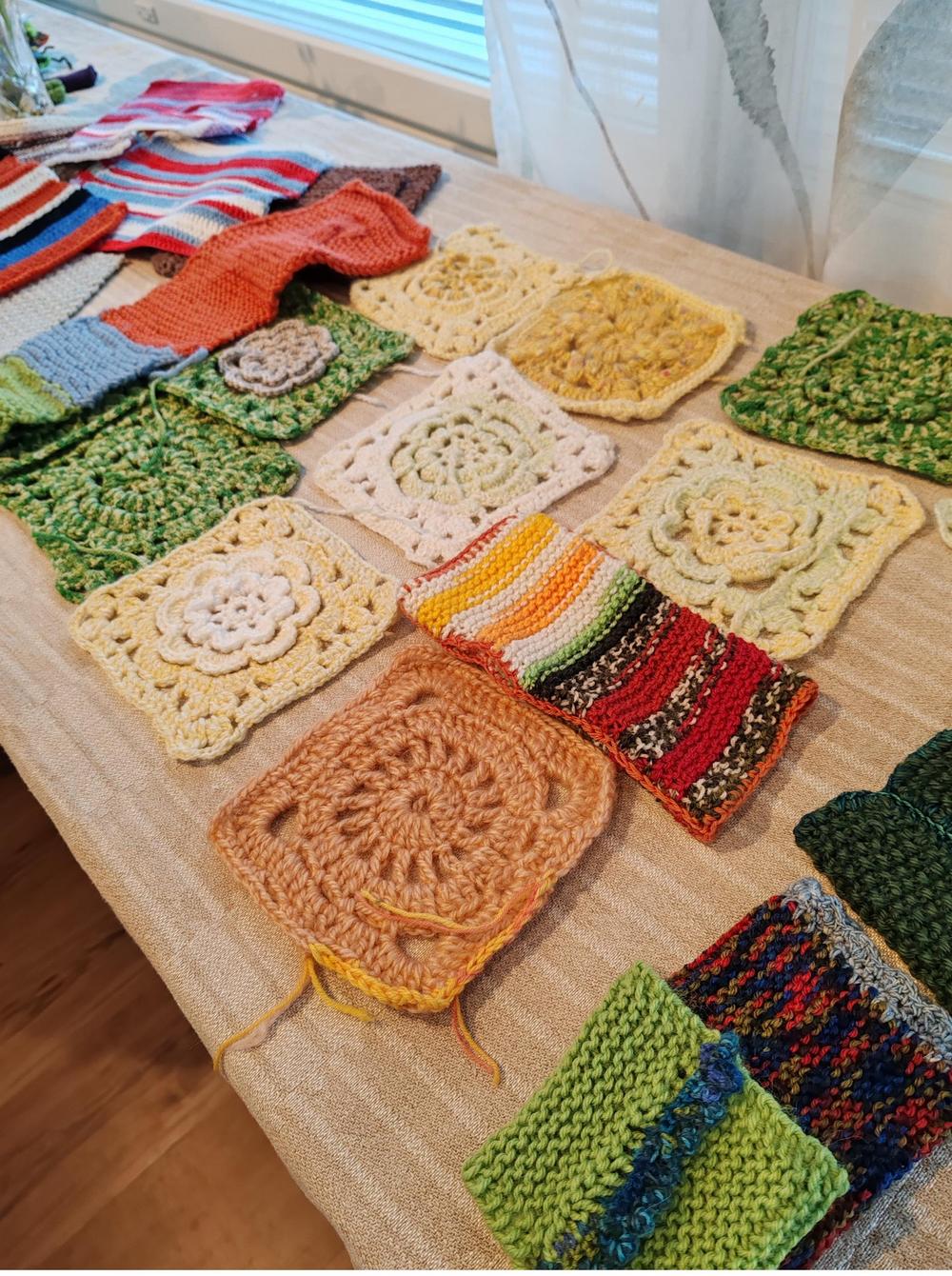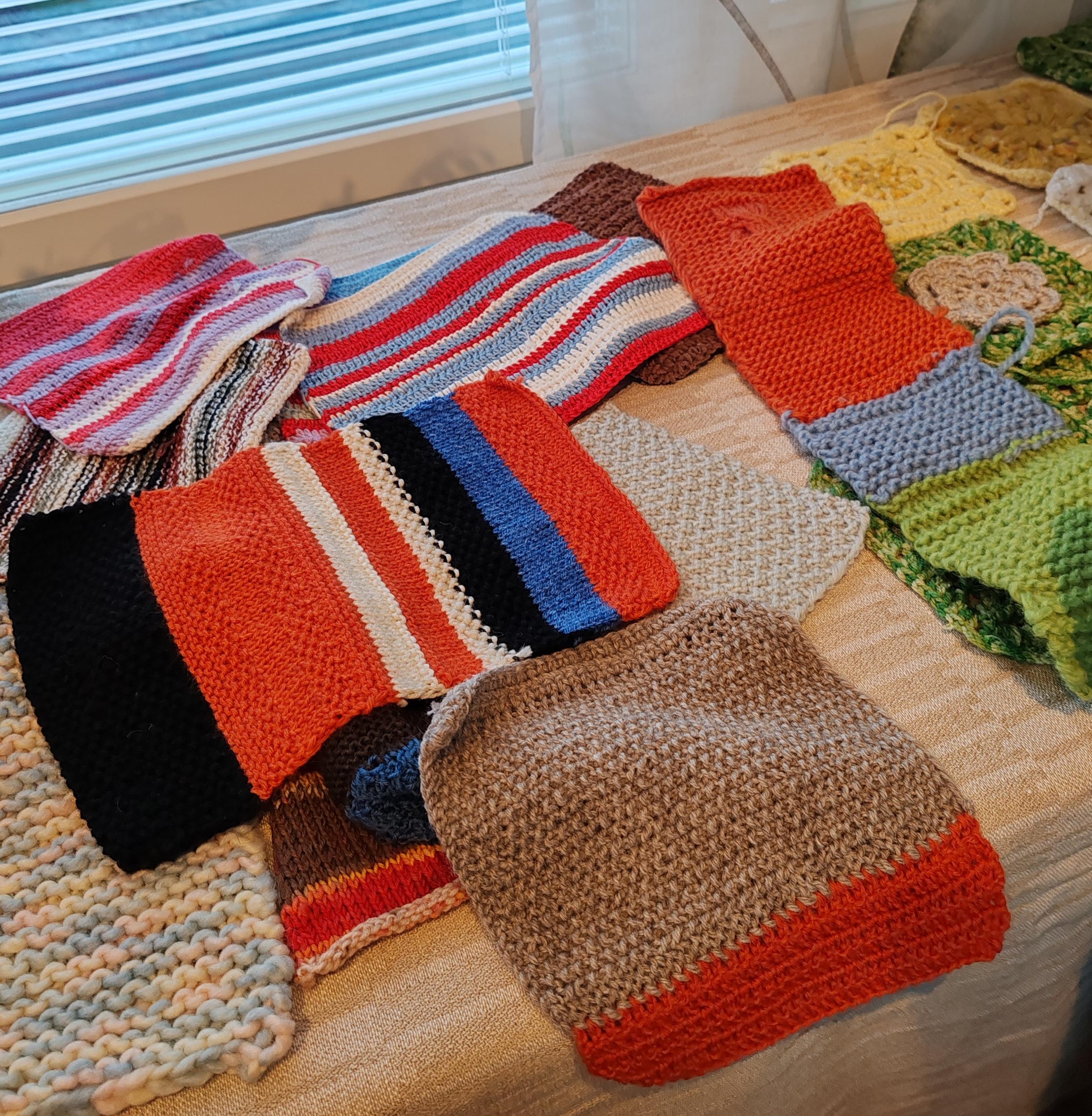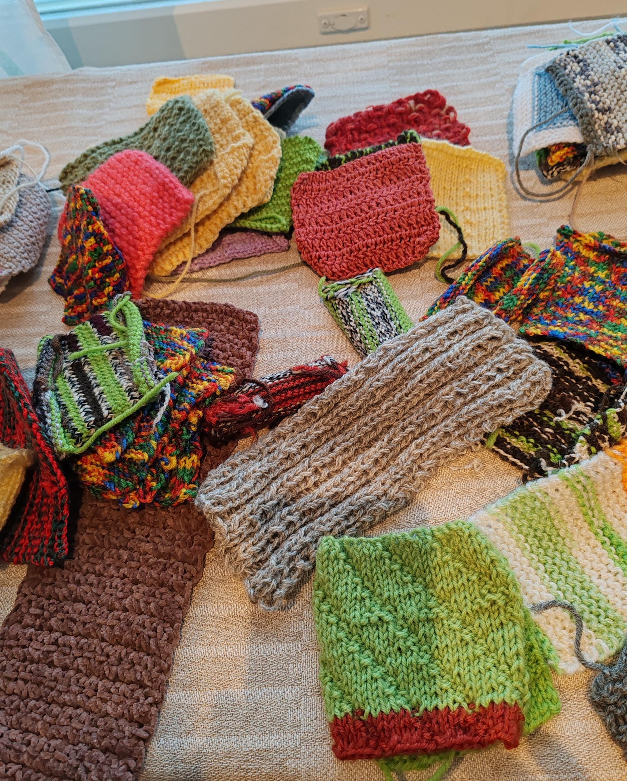 Meillä on tarjolla myös laatikollinen lankoja. Sen lisäksi olemme saaneet Aimokoulun varastoista valmiiksi neulottuja ja virkattuja lappusia, joista voisi tehdä ranteenlämmittimiä, kämmekkäitä tai pieniä huiveja lappuja yhdistämällä. Niistä saa värikkäitä tuotteita ompelemalla muutaman sauman.