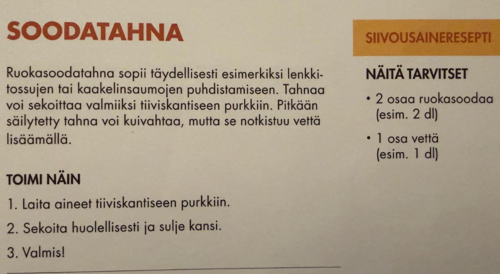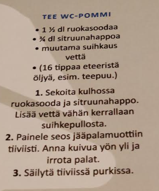 Monikäyttöisen pellavasaippuasuihkeen ohje löytyy kuvasta 1. Soodatahnalla puhdistuvat esim. lenkkitossujen saumat ja kaakelinsaumat, ks. kuva 2. Ikkunaputsi valmistuu helposti etikasta, parista tipasta astianpesuainetta ja vedestä, ks. kuva 3. Saimme myös hauskan joululahjavinkin - nimittäin WC-pommin. Sen valmistat helposti ohjeen mukaan, ks. kuva 4. Kaunis lasipurkki viimeistelee lahjan. Ei mikään turhake.