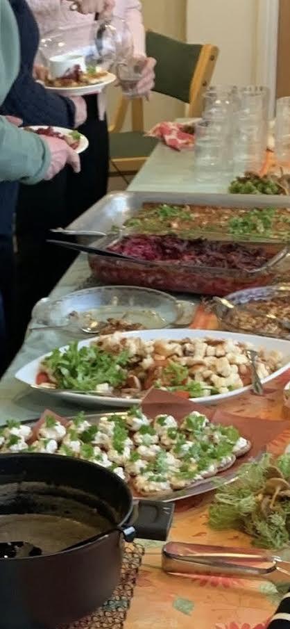 Tytti ja Sara keittiöapujoukon kanssa olivat valmistaneet maistiaisia pitkän pöydällisen. Erittäin mielenkiintoisia maistiaiset olivat sen tähden, että niiden raaka - aineena oli käytetty monia eri sienilajeja.